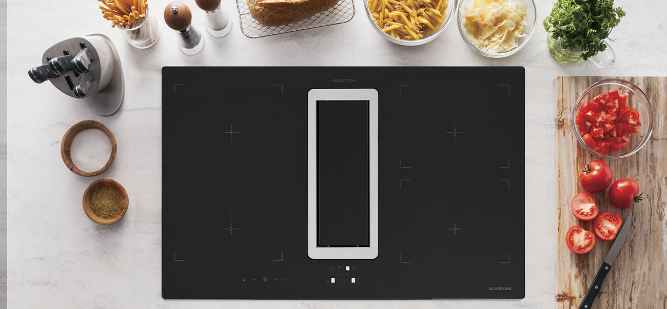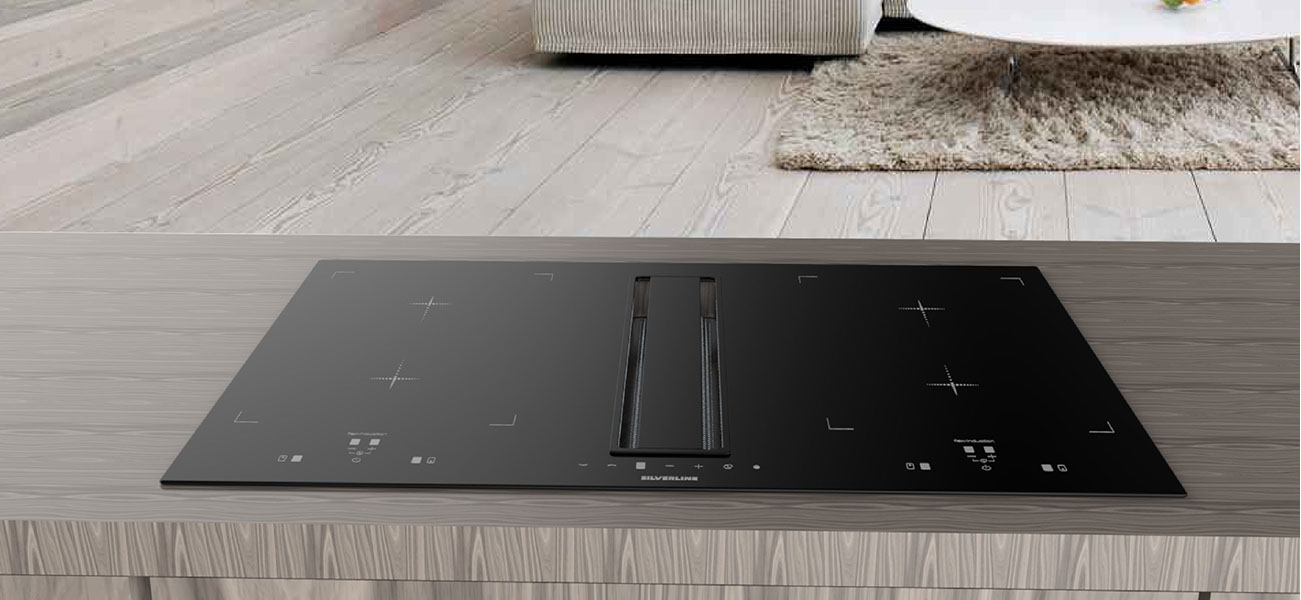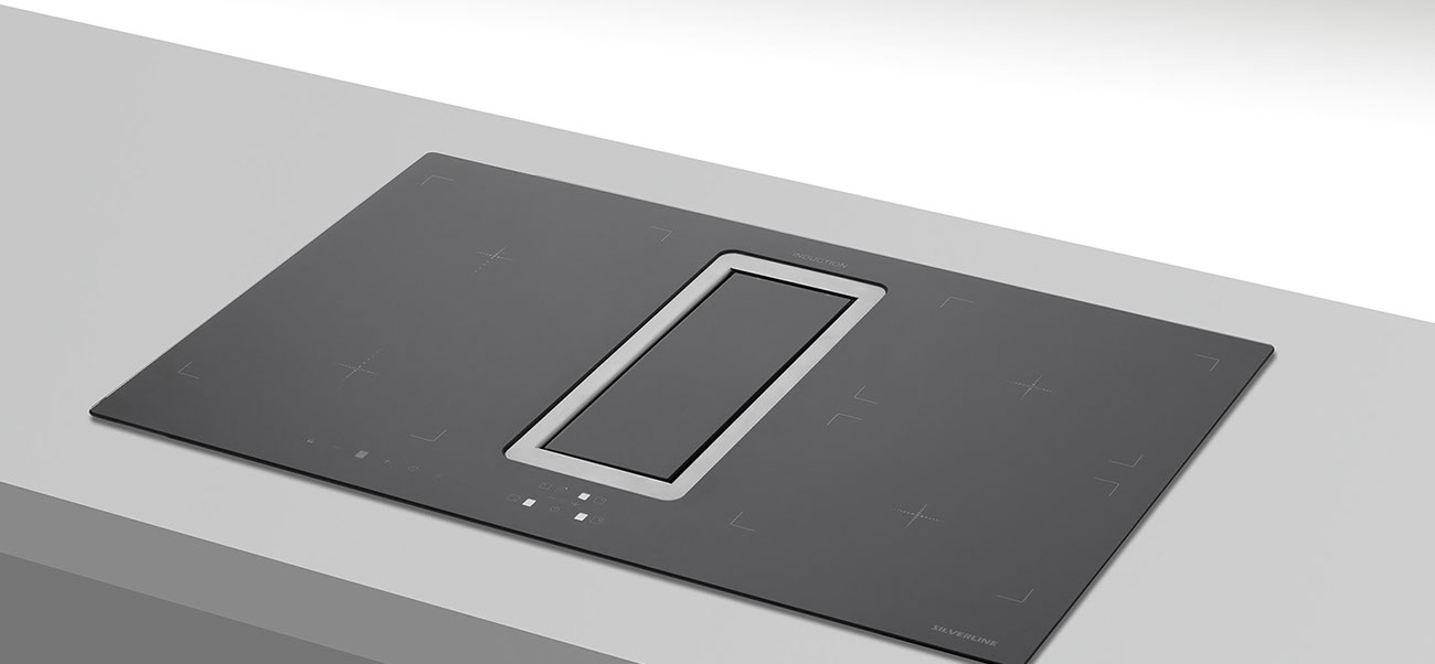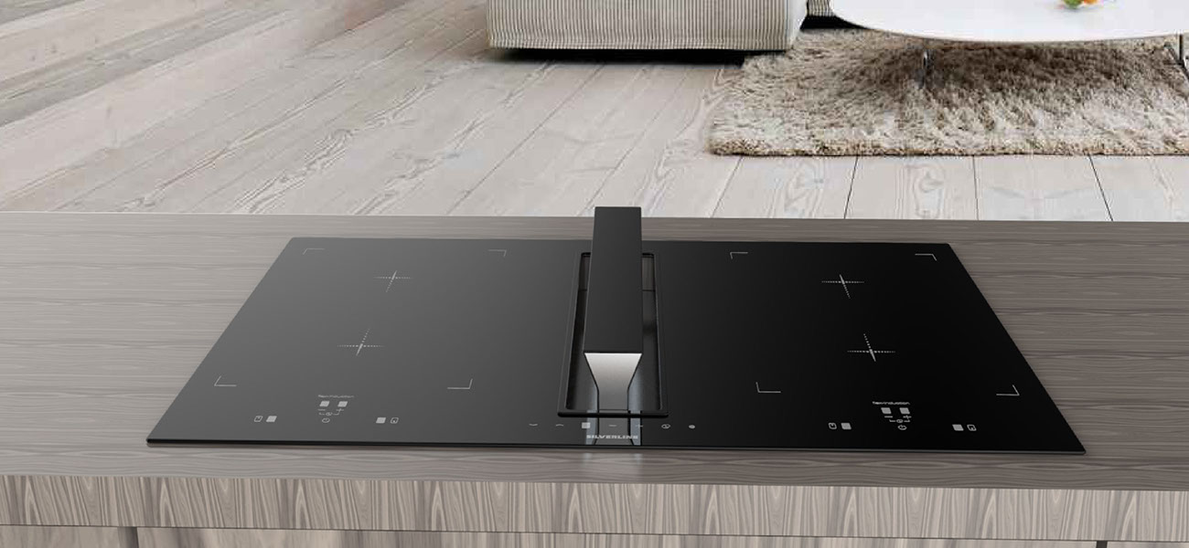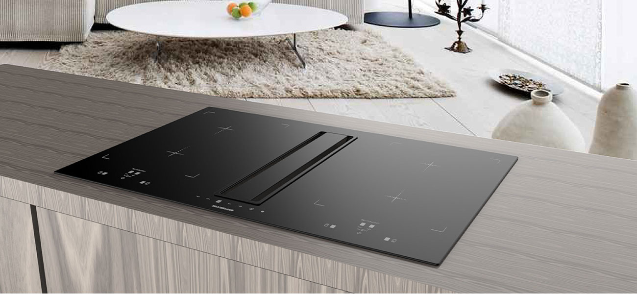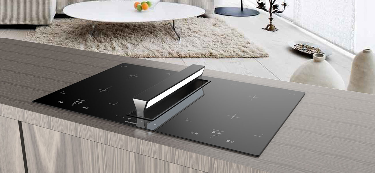 sidelighted seamless peripheral lighting panels with hi-performance extraction lightbox self-illuminated inner body with hi-performance extraction blackhole aerodynamic sidewalls providing hi-performance and ease of cleaning capture retractable range hood seamlessly integrated into cooktop with task lighting
