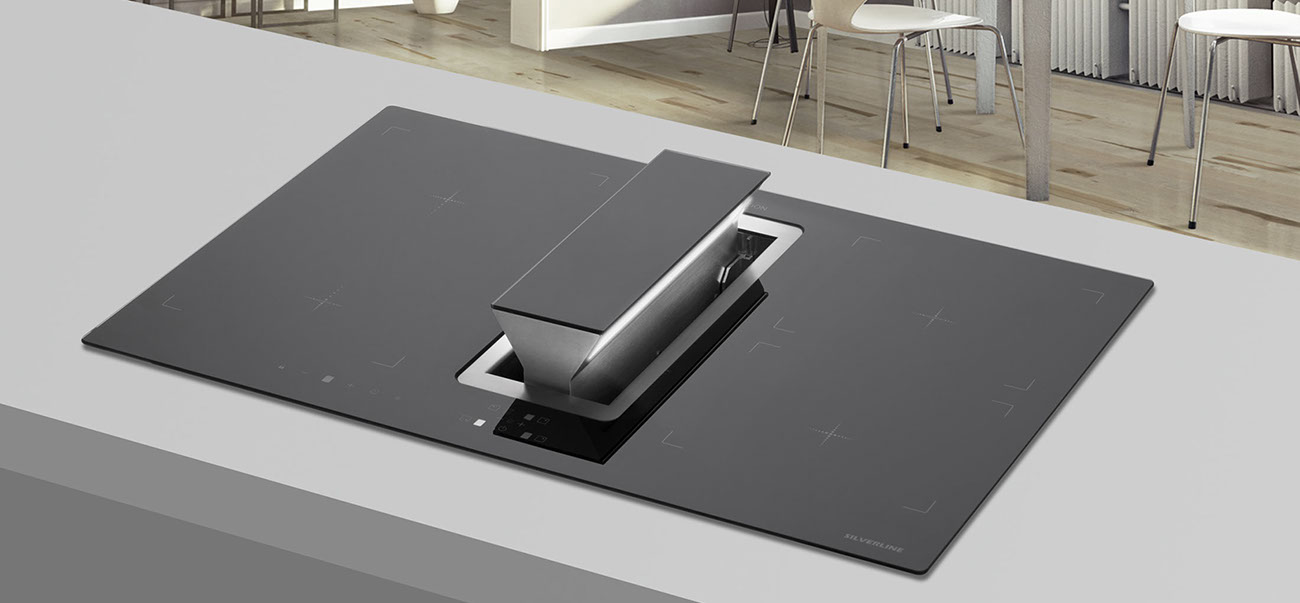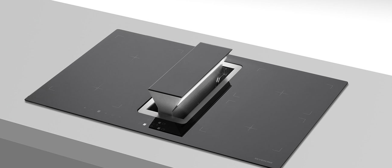 slide-down high performance ensured by the innovative integrated guided full surface extraction system wavy seamless architectural integration curvedge maximum balance and safety with seamless design flow-in seamless integration of cooktop and range hood skydoor comprehensive virtual window experience with ceiling extraction and daylighting