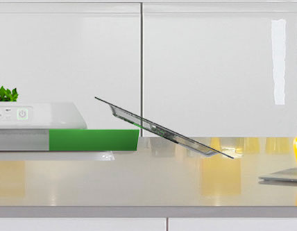breathe a living kitchen ventilation system which brings the outdoor air quality and pleasure of outdoor mealtimes into the kitchen by air ionizing technology and outdoor ambient lighting