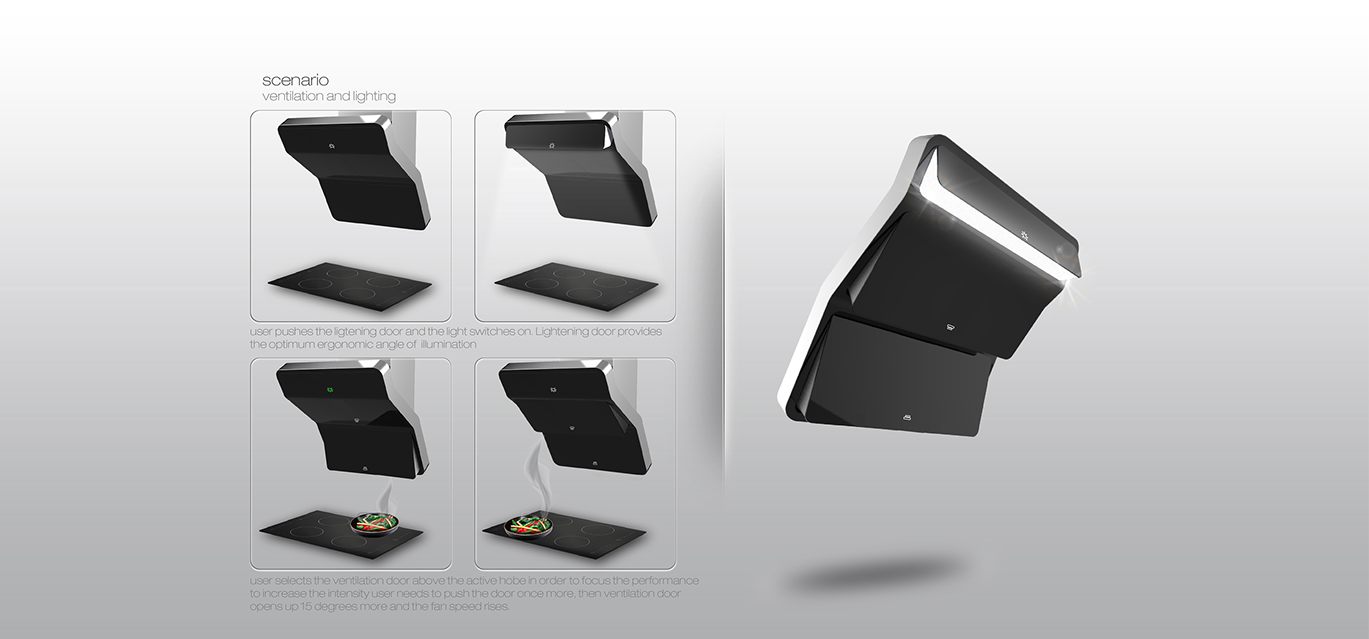 breathe a living kitchen ventilation system which brings the outdoor air quality and pleasure of outdoor mealtimes into the kitchen by air ionizing technology and outdoor ambient lighting